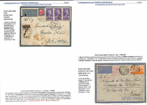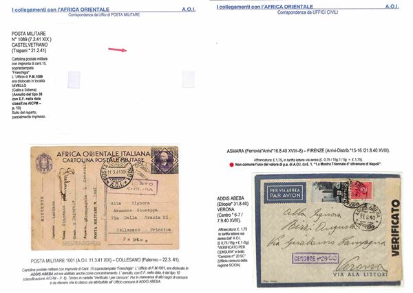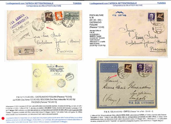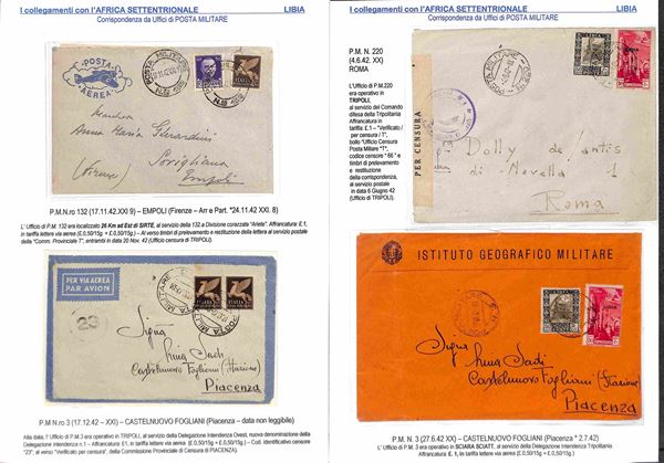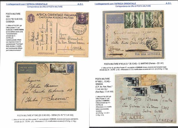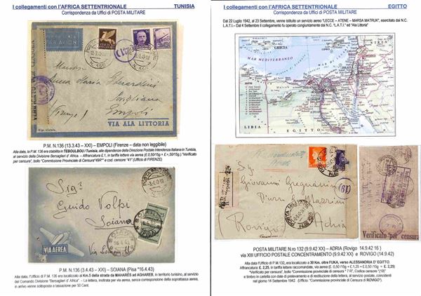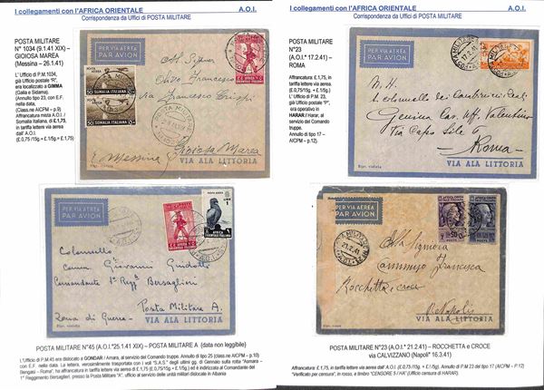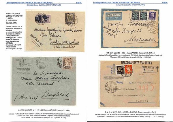 POSTA MILITARE - 1940/1943 - Collezione di 34 aerogrammi della linea S.A.S. da diversi uffici di Posta Militare dell'Africa Orientale principalmente AOI Tunisia Egitto e Libia - diverse buone presenze - montata su fogli A4 con didascalie