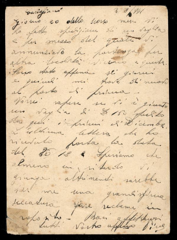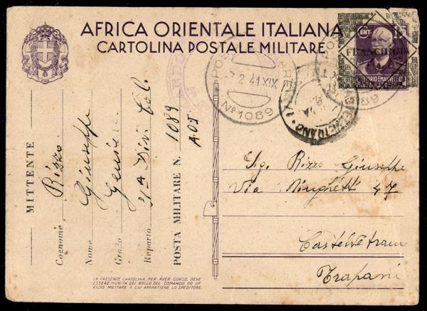 Posta Militare N. 1089 (Iavello) 7.2.41 (P.ti 13) - cartolina postale 15 cent in franchigia (F40) per Castelvetrano - difettosa in alto a destra