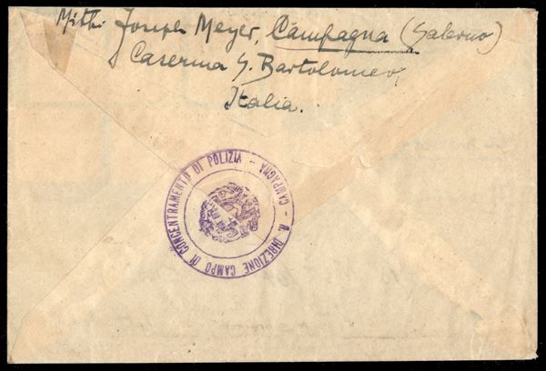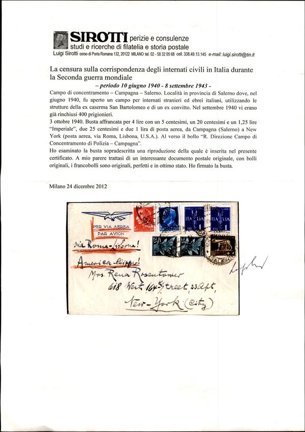 R. Direzione Campo di Concentramento di Polizia/Campagna - aerogramma affrancato per 4 lire (243 + 247 + Aerea 10 + 14) per New York del 3.10.40 - cert. Sirotti