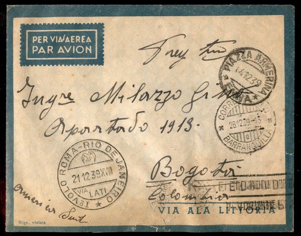 Roma Bogotà 21.12.39 (Longhi 3905) busta dall'Italia con annullo del 2° tipo affrancata al retro