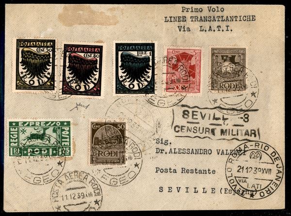 Roma Rio de Janeiro 21.12.39 - corriere da Rodi per Siviglia via Roma 11.12.39 (Longhi 3885) busta con affrancatura dell'egeo e annullo del 2° tipo - circa 20 aerogrammi volati - raro - Chiavarello