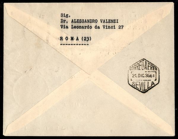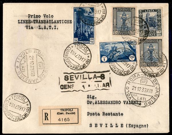 Roma Rio de Janeiro 21.12.39 - corriere dalla Tripolitania per Siviglia via Roma 18.12.39 (Longhi 3886) busta affrancata con valori di Libia e Tripolitania con annullo del 2° tipo - circa 25 aerogrammi volati - raro