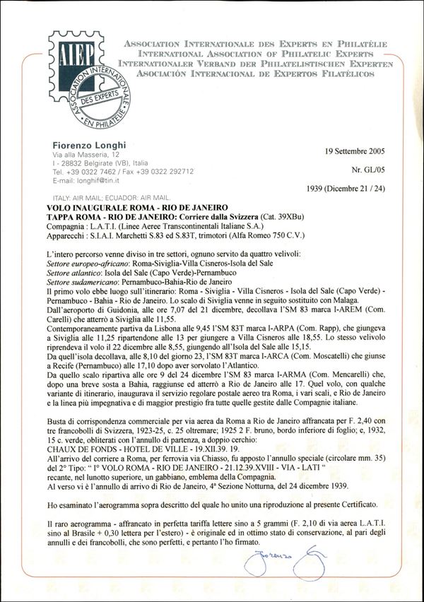 Roma Rio de Janeiro 21.12.39 - corriere della Svizzera (Longhi 3902) busta da Caux de Fonds del 19.12.39 - pochissimi aerogrammi volati - molto raro - cert. Longhi