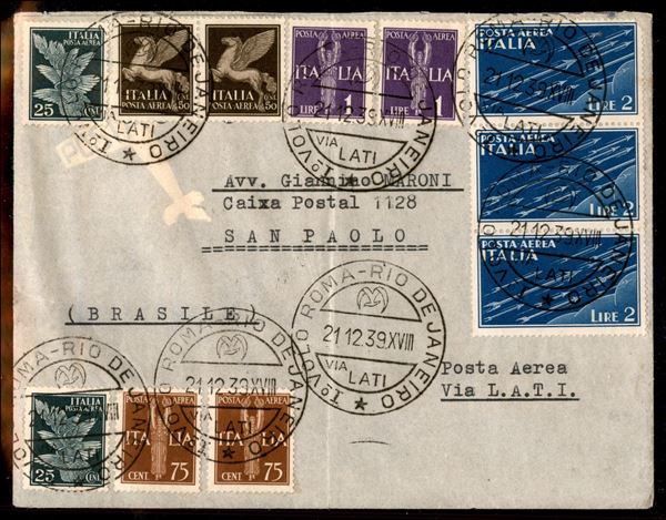 Roma san Paolo 21.12.39 (Longhi 3905) busta dall'Italia con annullo del 2° tipo - bella affrancatura di Posta Aerea Regno