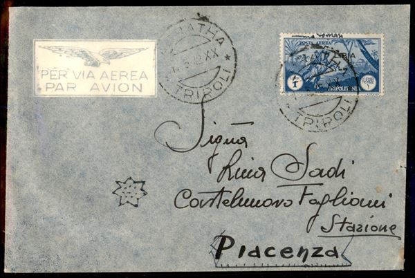 Sabratha (Tripoli) 17.5.42 (P.ti 12) - aerogramma affrancato per 1 lira (29) per Castelnuovo Fogliani - raro annullamento