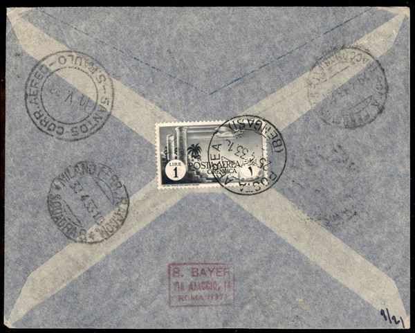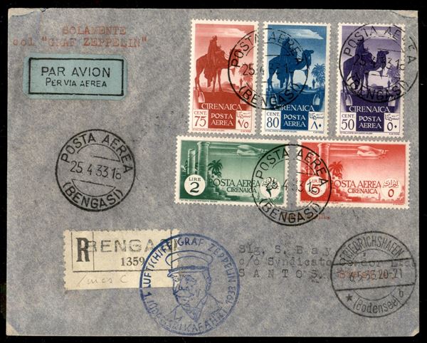 1° Volo in Sud America/1° Sudamerikafahrt - 6/9 maggio 1933 (Longhi 177 - Michel 294a) busta da Bengasi del 25.4.33 per Santos