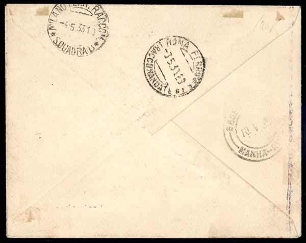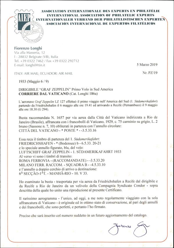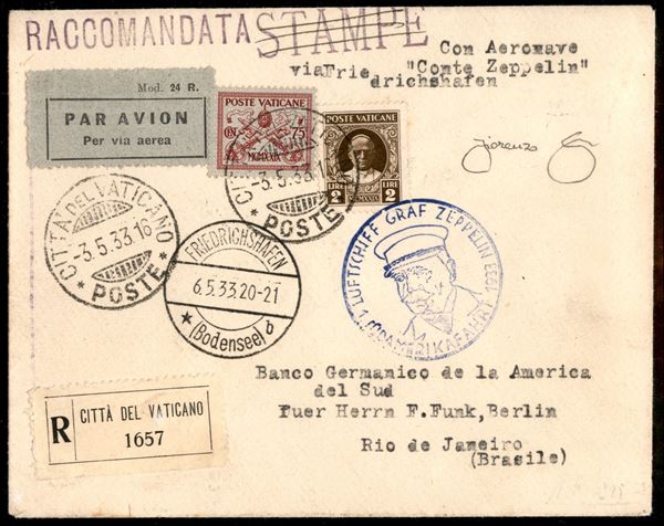 1° Volo in Sud America/1° Sudamerikafahrt - 6/9 maggio 1933 (Longhi 186a - Michel 294a) busta da Cittą del Vaticano del 3.5.33 per Rio de Janeiro affrancata con solo valori di Vaticano - unico noto - rarissimo - cert. Longhi