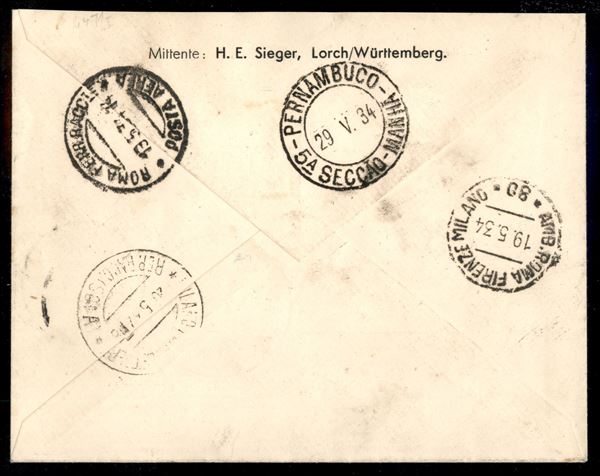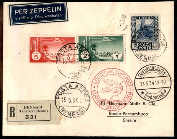 1° Volo in Sud America/1° Sudamerikafahrt 26/29 maggio 1934 (Longhi 856 - Michel 362) busta dalla Cirenaica