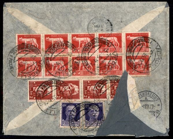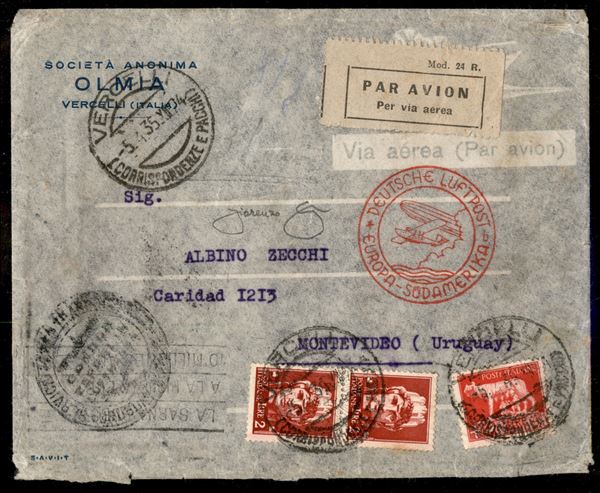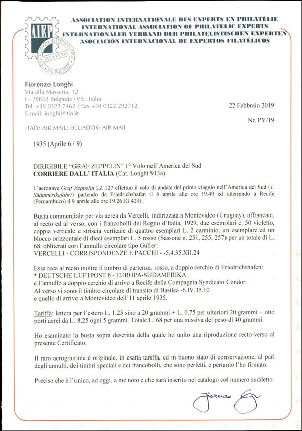 1° Volo in Sud America/1° Sudamerikafahrt 6/9 aprile 1935 (Longhi 913a - Michel 429 var.) busta da Vercelli del 5.4.35 - unico noto - molto raro - cert. Longhi