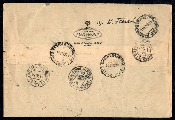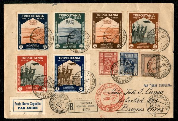 10° Volo in Sud America/10° Sudamerikafahrt 13/16 ottobre 1934 (Longhi 895 - Michel 410) busta dalla Tripolitania affrancata con serie completa Arte Coloniale Posta Aerea - molto bella