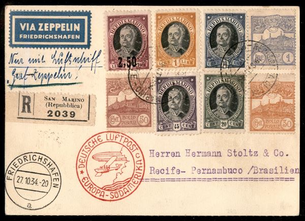11° Volo in Sud America/11° Sudamerikafahrt 27/30 ottobre 1934 (Longhi 900 - Michel 414) cartolina da San Marino affrancata fronte retro - un francobollo difettoso al retro