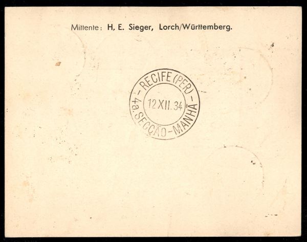 12° Volo in Sud America (Natale)/12° Sudamerikafahrt (Weihnachten) 8/12 dicembre 1934 (Longhi 905 - Michel 418) cartolina da Rodi (Egeo) - Longhi