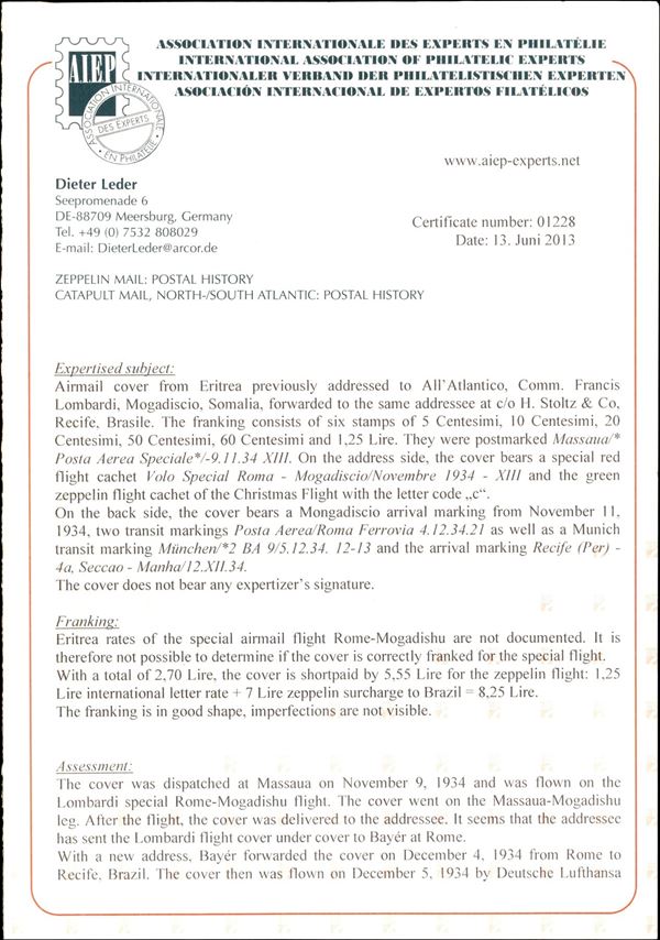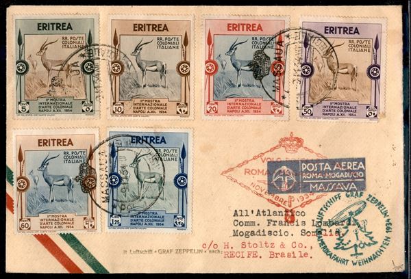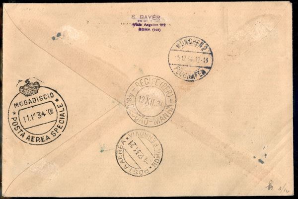 12° Volo in Sud America (Natale)/12° Sudamerikafahrt (Weihnachten) 8/12 dicembre 1934 - volo Roma Mogadiscio Francis Lombardi interrotto e rispedito via Zeppelin in Brasile (Longhi 910 - Michel 418) busta da Massaua (Eritrea) del 9.11.34 - molto raro - cert. Dieter Leder