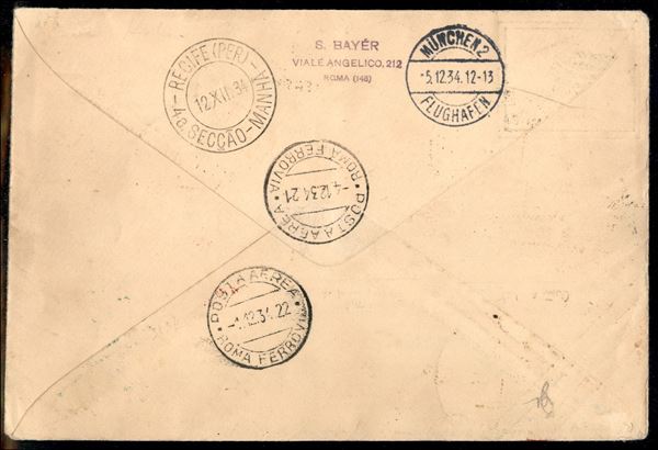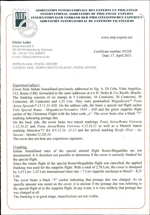 12° Volo in Sud America (Natale)/12° Sudamerikafahrt (Weihnachten) 8/12 dicembre 1934 - volo Roma Mogadiscio Francis Lombardi interrotto e rispedito via Zeppelin in Brasile (Longhi 911 - Michel 418) busta da Mogadiscio (Somalia) del 13.11.34 - molto raro - cert. Dieter Leder