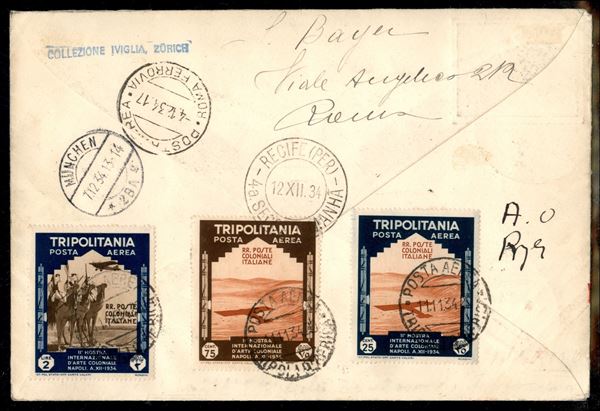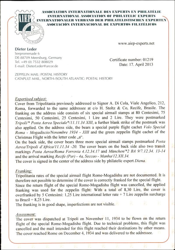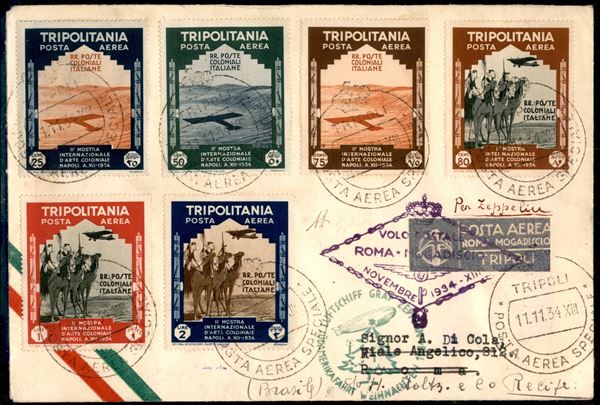 12° Volo in Sud America (Natale)/12° Sudamerikafahrt (Weihnachten) 8/12 dicembre 1934 - volo Roma Mogadiscio Francis Lombardi interrotto e rispedito via Zeppelin in Brasile (Longhi 912 - Michel 418) busta da Tripoli (Tripolitania del 11.11.34 - molto raro - cert. Dieter Leder