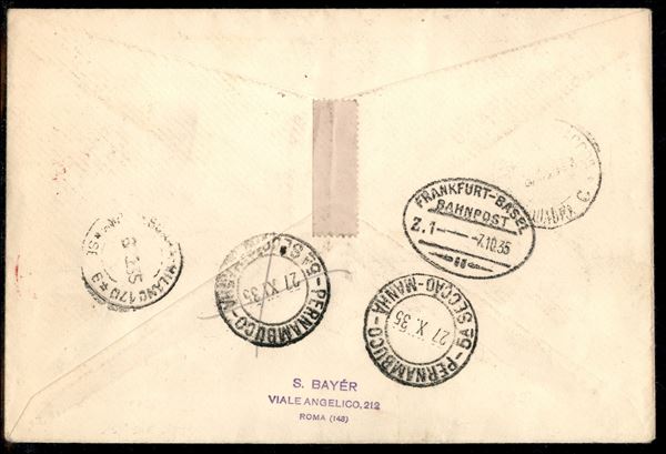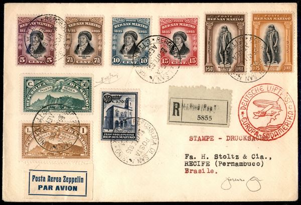 15° Volo in Sud America/15° Sudamerikafahrt 23/26 ottobre 1935 (Longhi 926 - Michel 490) busta da San Marino con bella affrancatura con valori serie Palazzetti - Raybaudi + Longhi
