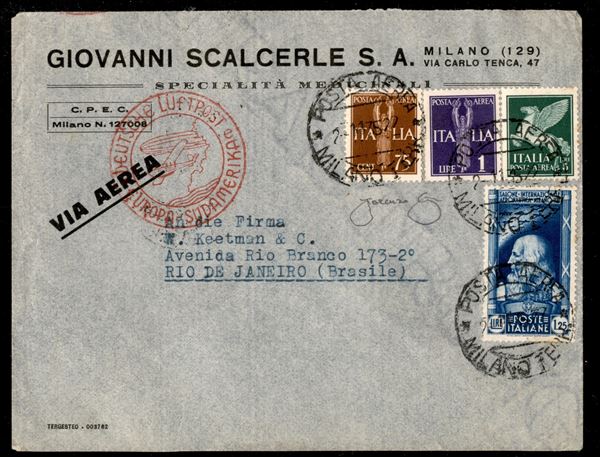 16° Volo in Sud America/16° Sudamerikafahrt 7/10 novembre 1935 (Longhi 928 - Michel 496) busta da Milano del 2.11.35 - riprodotta a pag. 256 del catalogo Longhi - molto bello - Longhi