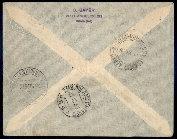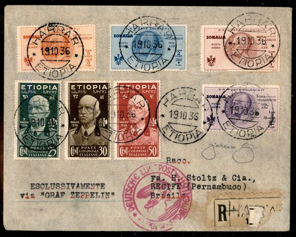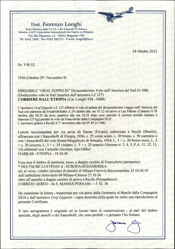 17° Volo in Sud America/17° Sudamerikafahrt 29 ottobre/1 novembre 1936 (Longhi 938 - Michel 568) busta dall'Etiopia - raro - cert. Longhi