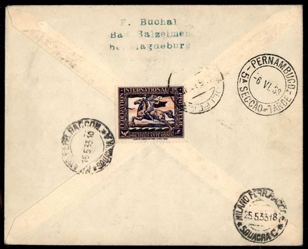 2° Volo in Sud America/2° Sudamerikafahrt - 3/6 giugno 1933 - corriere da Friedrichshafen o Berlino e diretto in Sud America (Longhi 748a - Michel 305 var.) busta da Rodi con affrancatura di posta ordinaria per Pernambuco - unica nota - rarissimo - Longhi