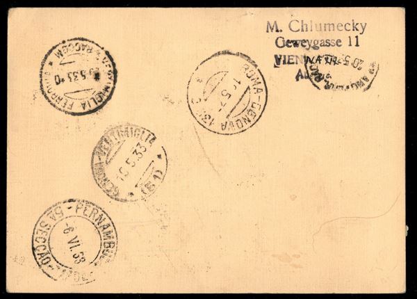 2° Volo in Sud America/2° Sudamerikafahrt - 3/6 giugno 1933 - corriere da Friedrichshafen o Berlino e diretto in Sud America (Longhi 750 - Michel 305a) cartolina da Asmara con affrancatura di posta ordinaria per Pernambuco