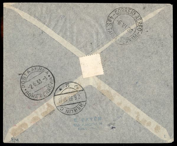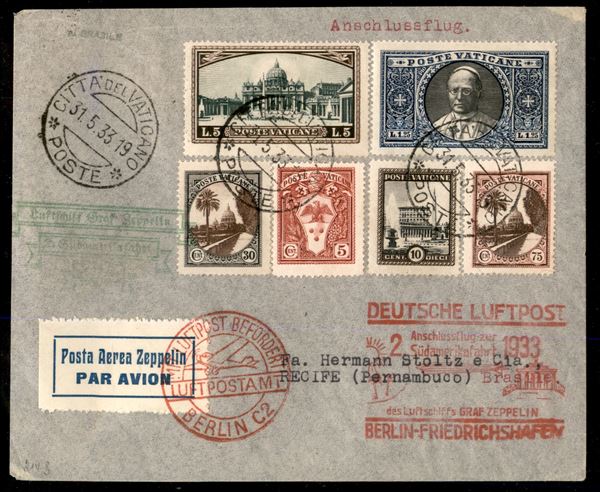 2° Volo in Sud America/2° Sudamerikafahrt - 3/6 giugno 1933 - corriere da Friedrichshafen o Berlino e diretto in Sud America (Longhi 752 - Michel 305a) busta da Cittą del Vaticano con affrancatura ordinaria per Pernambuco - cachet rosso del collegamento - 20 lettere note - raro