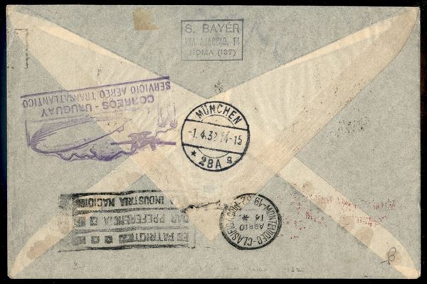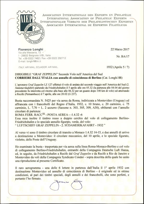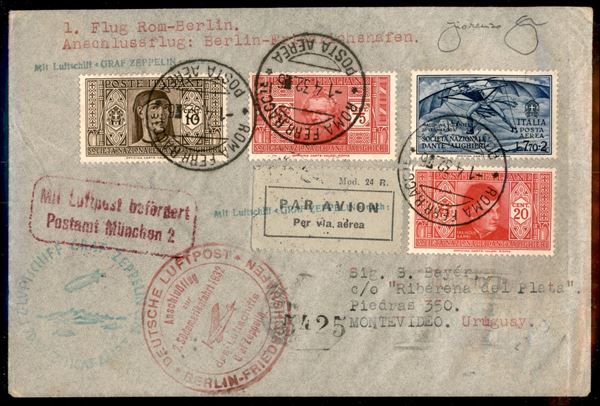 2° Volo in Sud America/2° Sudamerikafahrt - 4/13 aprile 1932 - coincidenza Berlino Friedrichshafen (Longhi 88 - Michel 237b) busta da Roma Ferr. del 1.4.32 per Montevideo con affrancatura di Regno - 6 buste volate - molto raro - cert. Longhi