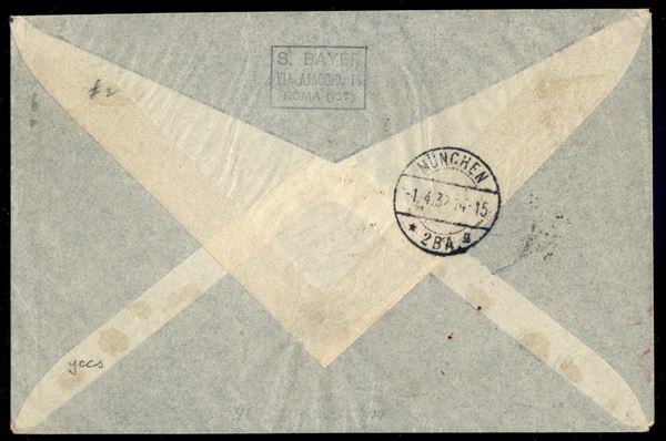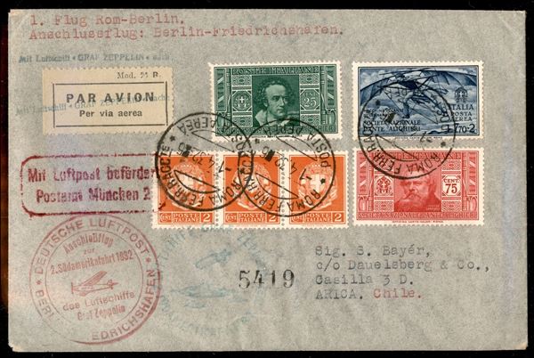 2° Volo in Sud America/2° Sudamerikafahrt - 4/13 aprile 1932 - coincidenza Berlino Friedrichshafen - 1° Volo Roma Berlino (Longhi 89 - Michel 237b) busta da Roma Ferr. del 1.4.32 per Arica (Cile) con affrancatura di Regno - 6 buste volate - molto raro
