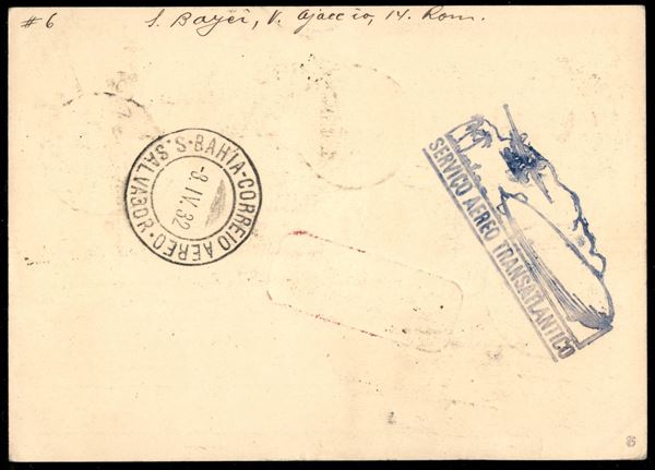 2° Volo in Sud America/2° Sudamerikafahrt - 4/13 aprile 1932 - coincidenza Berlino Friedrichshafen (Longhi 90 - Michel 237b) intero postale da Roma Aeroporto del 2.4.32 per Bahia (Brasile) con affrancatura aggiuntiva di Regno - 10 cartoline volate - raro - Longhi