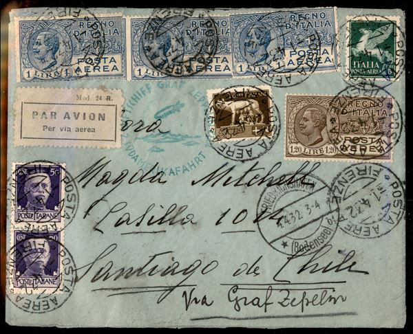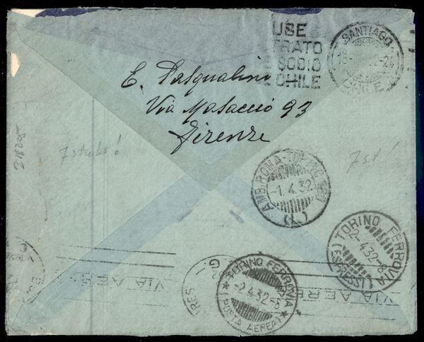 2° Volo in Sud America/2° Sudamerikafahrt - 5/7 aprile 1932 (Longhi 79 - Michel 237a) busta da Firenze del 1.4.32 per Santiago del Cile con affrancatura di Regno