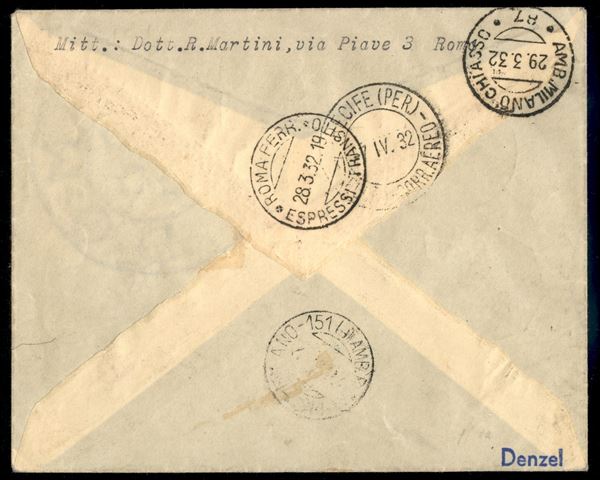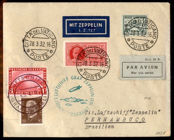 2° Volo in Sud America/2° Sudamerikafahrt - 5/7 aprile 1932 (Longhi 84 - Michel 237a) busta da Cittą del Vaticano del 28.3.32 per Pernambuco con affrancatura combinata Vaticano Germania per doppia spedizione - 4 buste volate - molto raro