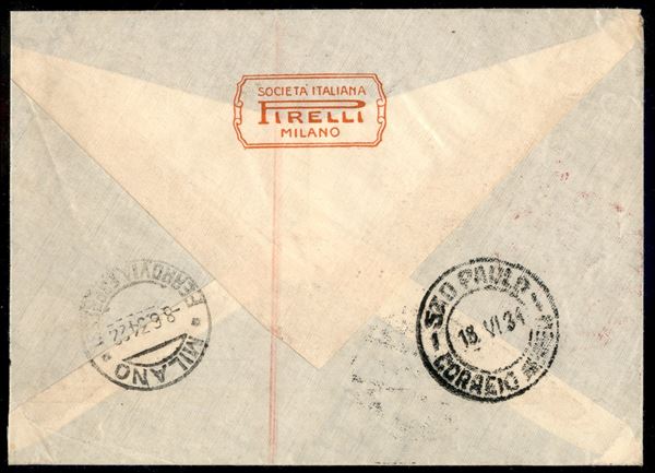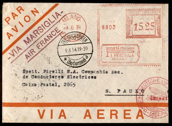2° Volo in Sud America/2° Sudamerikafahrt 9/12 giugno 1934 (Longhi 865 var. - Michel 366 var.) busta da Milano del 8.6.34 con tariffa assolta a mezzo di affrancatura meccanica
