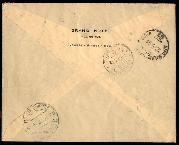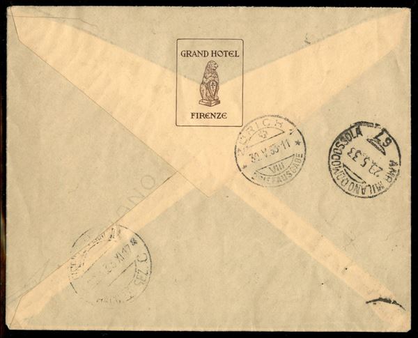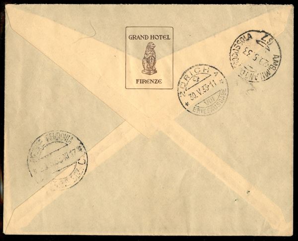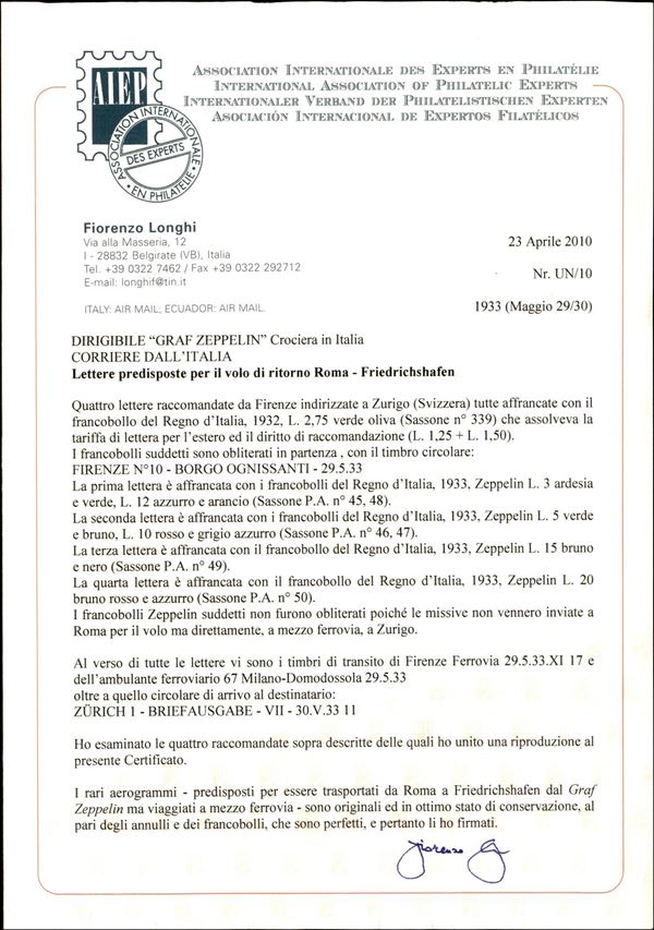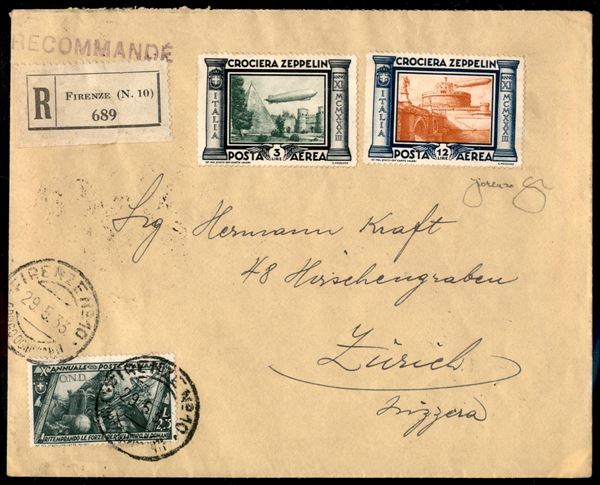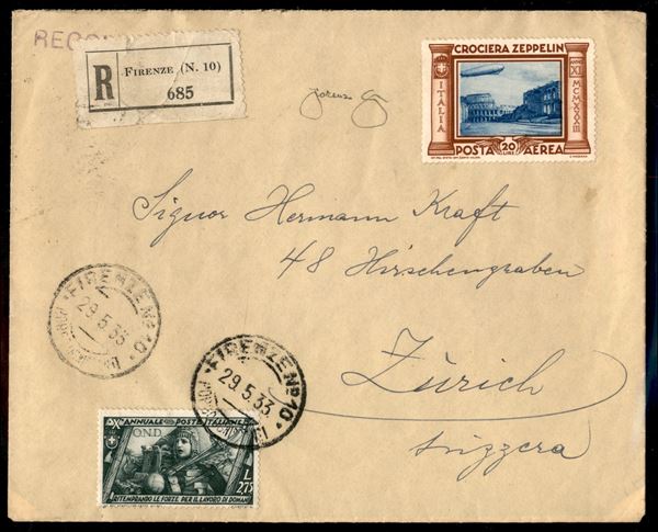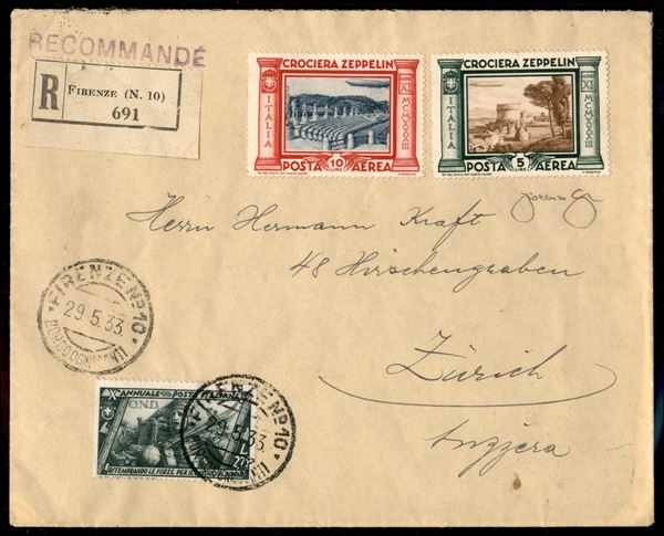 29/30 maggio 1933 - Insieme di 4 lettere raccomandate da Firenze a Zurigo con la serie completa Zeppelin (45/50) predisposte per il volo Roma Freidrichshafen ma non impostate - insieme non comune - cert. Longhi