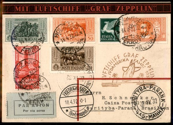 3° Volo in Sud America/3° Sudamerikafahrt - 17/20 aprile 1932 (Longhi 95 - Michel 239) cartolina da Bolzano del 14.4.32 per Parana (Brasile) con affrancatura di Regno