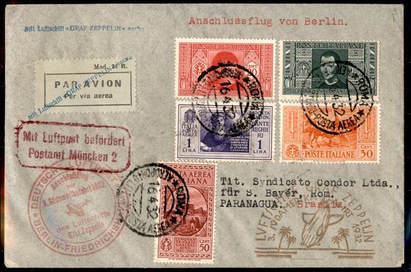 3° Volo in Sud America/3° Sudamerikafahrt - 17/20 aprile 1932 - coincidenza Berlino Friedrichshafen (Longhi 101 - Michel 239b) busta da Roma del 16.4.32 per Paranagua con affrancatura di Regno