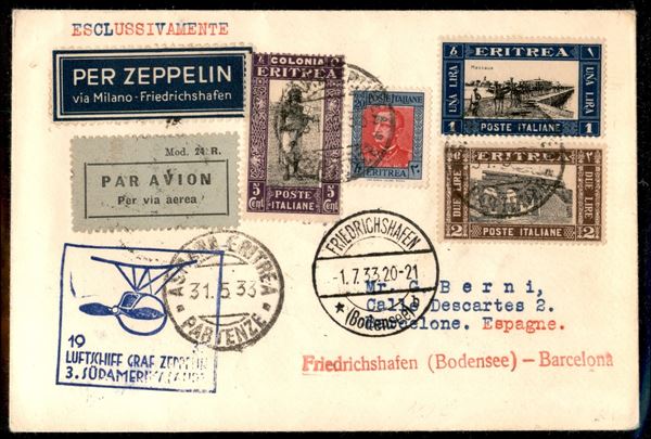 3° Volo in Sud America/3° Sudamerikafahrt -1/4 luglio 1933 - lancio su Barcellona (Longhi 757 - Michel 315 Ia) busta da Asmara - 10 lettere note - molto raro