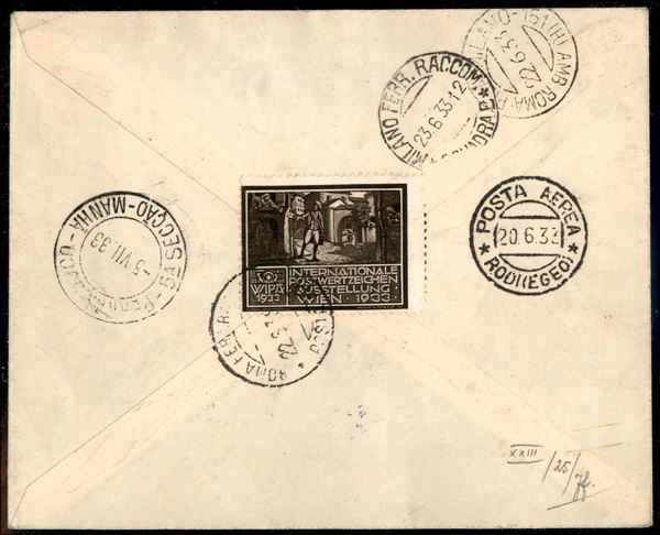 3° Volo in Sud America/3° Sudamerikafahrt -1/4 luglio 1933 - corriere da Friedrichshafen e diretto in Sud America (Longhi 767 - Michel 315) busta da Simi per Pernambuco affrancata con valori gemelli e chiudilettera Wipa 1933 al retro - molto bello