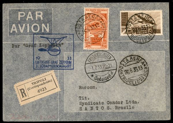 3° Volo in Sud America/3° Sudamerikafahrt -1/4 luglio 1933 - corriere da Friedrichshafen e diretto in Sud America(Longhi 772 - Michel 315) busta da Tripoli d'Africa - 10 lettere note indirizzate a Santos - molto raro