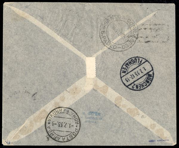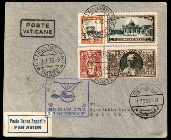 3° Volo in Sud America/3° Sudamerikafahrt -1/4 luglio 1933 - corriere da Friedrichshafen e diretto in Sud America (Longhi 773 - Michel 315) busta da Cittą del Vaticano - 6 lettere note indirizzate a Santos - molto raro