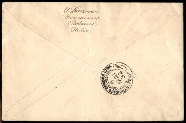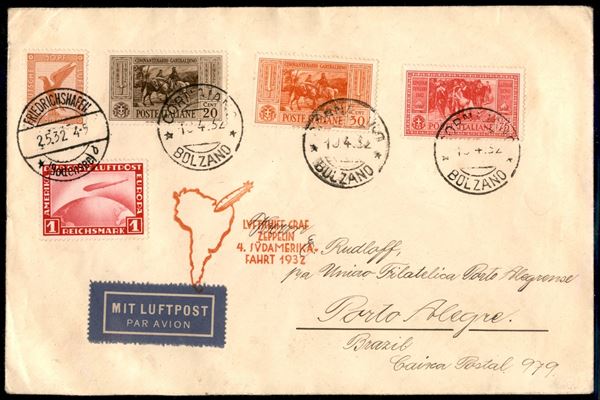 4° Volo in Sud America/4° Sudamerikafahrt - 2/5 maggio 1932 (Longhi 105 - Michel 241a) busta da Bolzano del 17.4.32 per Porto Alegre con affrancatura mista Italia Germania - poche buste volate - raro