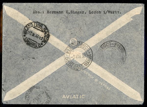 4° Volo in Sud America/4° Sudamerikafahrt - 5/8 agosto 1933 (Longhi 782 - Michel 323a) busta da Tripoli d'Africa con 5 lire Posta Aerea di Tripolitania
