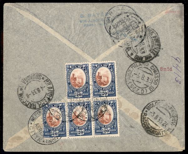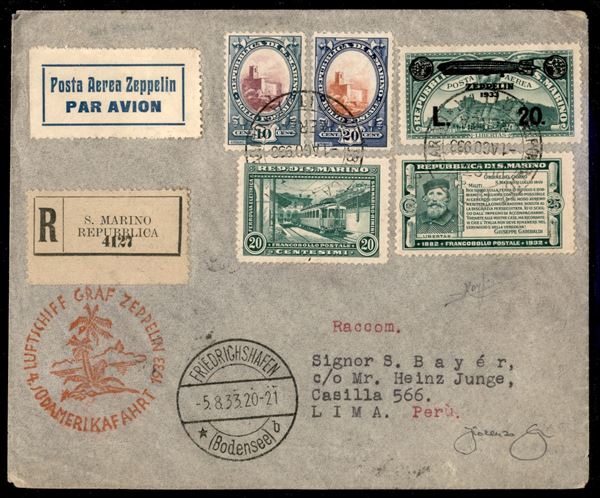 4° Volo in Sud America/4° Sudamerikafahrt - 5/8 agosto 1933 - corriere affrancato con Zeppelin (Longhi 786 - Michel 323a var.) busta da San Marino affrancata con 20 lire Zeppelin + complementari fronte retro - unica nota - riprodotta a pag. 214 del catalogo Longhi - rarissimo - ex asta Tresor - Longhi