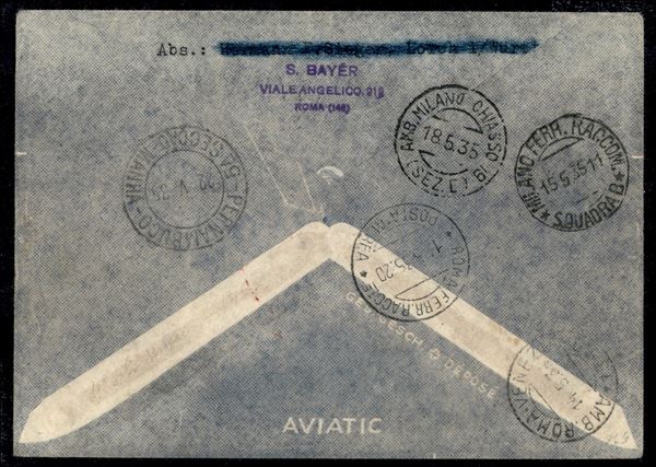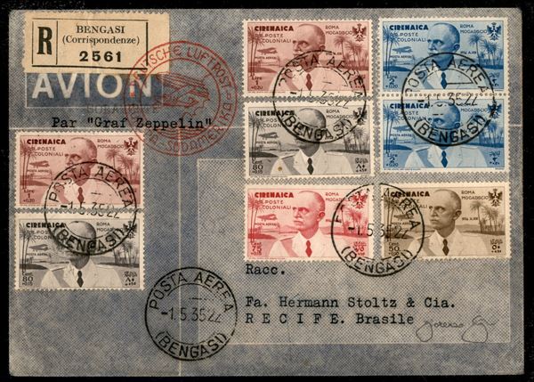4° Volo in Sud America/4° Sudamerikafahrt 19/21 maggio 1935 (Longhi 916 - Michel 442) busta dalla Cirenaica con bella affrancatura della serie di Posta Aerea Roma Mogadiscio - Longhi