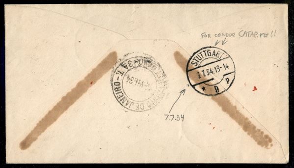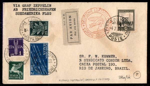 4° Volo in Sud America/4° Sudamerikafahrt 21/24 luglio 1934 (Longhi 879 - Michel 381) busta da Cittą del Vaticano con affrancatura mista Vaticano + Italia - trasportato con il collegamento Stoccarda Friedrichshafen - non comune