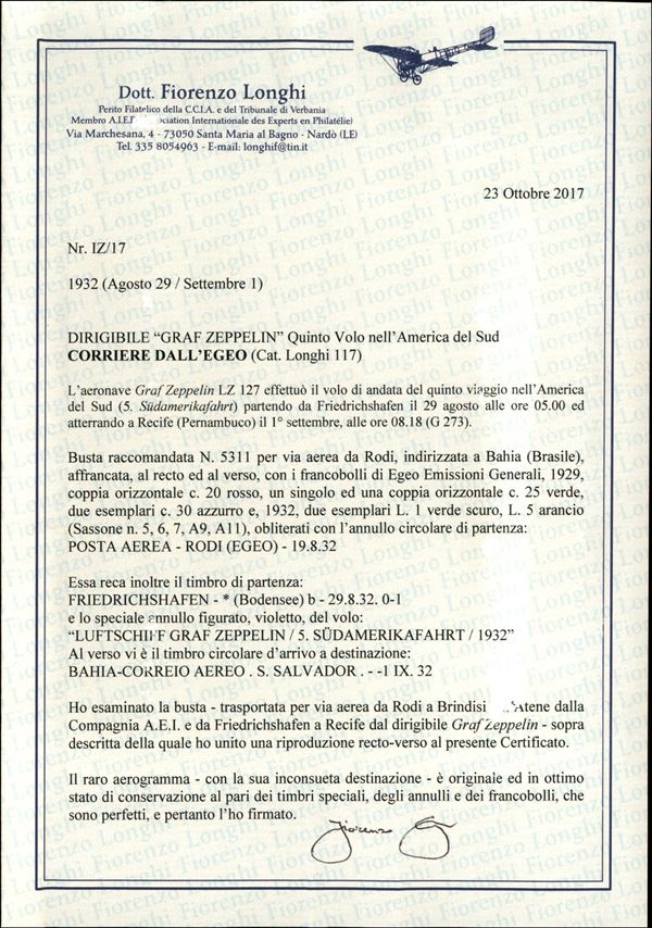 5° Volo in Sud America/5° Sudamerikafahrt - 29 agosto/1 settembre 1932 (Longhi 117 - Michel 273a) busta da Rodi del 19.8.32 per Bahia (Brasile) affrancata con valori delle Colonie Italiane fronte retro - cert. Longhi