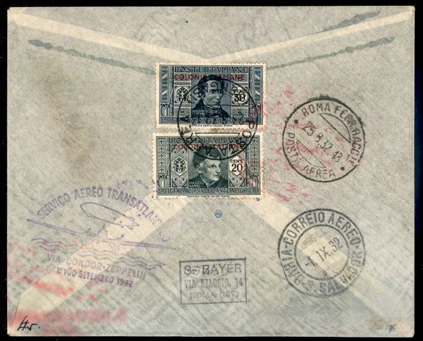 5° Volo in Sud America/5° Sudamerikafahrt - 29 agosto/7 settembre 1932 - coincidenza Stoccarda Friedrichshafen (Longhi 126 - Michel 273c) busta da Bengasi del 23.8.32 per Bahia affrancata con valori di Colonie fronte retro - 5 lettere volate