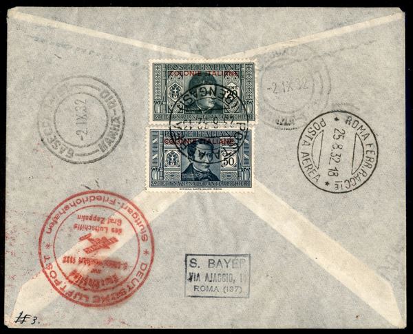 5° Volo in Sud America/5° Sudamerikafahrt - 29 agosto/7 settembre 1932 - coincidenza Stoccarda Friedrichshafen (Longhi 128 - Michel 273c) busta da Bengasi del 23.8.32 per Rio de Janeiro affrancata con valori di Colonie fronte retro - 2 lettere volate - Diena
