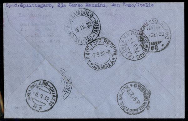6° Volo in Sud America/6° Sudamerikafahrt - 12/15 settembre 1932 (Longhi 138a - Michel 275) busta da Castelrosso del 28.8.32 per Pernambuco con affrancatura mista Egeo + Regno d'Italia - unico conosciuto - rarissimo - Longhi