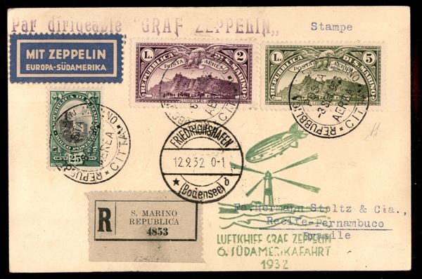 6° Volo in Sud America/6° Sudamerikafahrt - 12/15 settembre 1932 (Longhi 140 - Michel 275) cartolina da San Marino del 8.9.32 per Recife - Diena