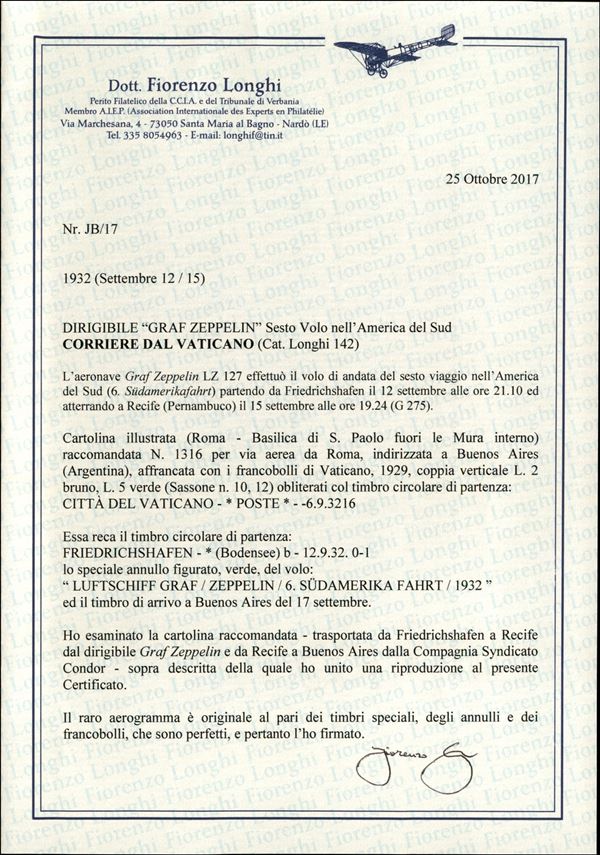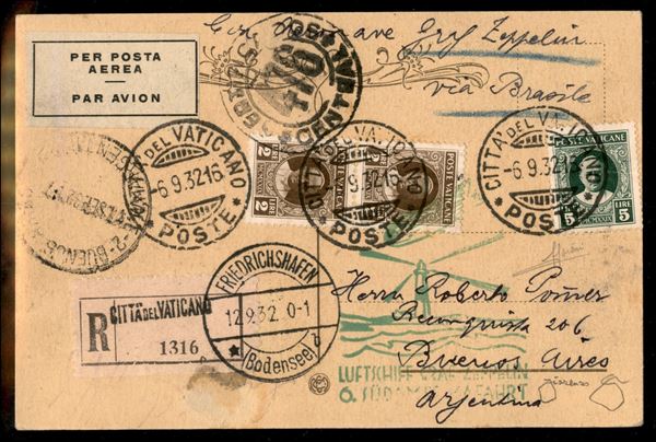 6° Volo in Sud America/6° Sudamerikafahrt - 12/15 settembre 1932 (Longhi 142 - Michel 275) cartolina da Cittą del Vaticano del 6.9.32 per Buenos Aires - molto raro - Sorani + cert. Longhi