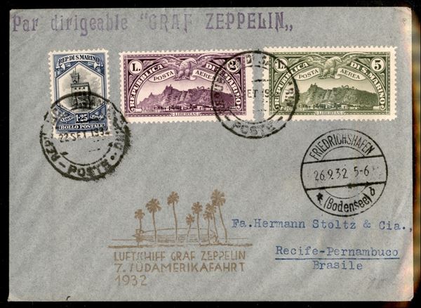 7° Volo in Sud America/7° Sudamerikafahrt - 26/29 settembre 1932 (Longhi 148 - Michel 279a) busta da San Marino del 22.9.32 per Recife